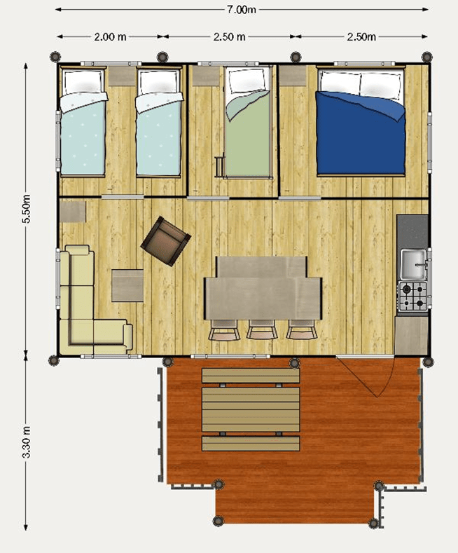 La tente est entièrement équipée avec des lits confortables, un coin salon agréable et un coin cuisine pratique. Profitez de la vie en plein air sur la terrasse privée, tandis que les enfants peuvent jouer en toute sécurité dans la nature environnante.